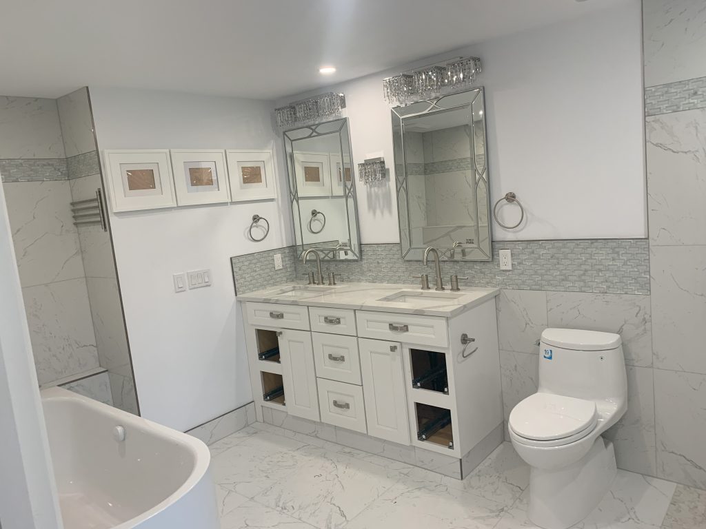 We transformed this client’s extra bathroom into a brightly lit guest bathroom with a dark accent theme. We had a lot of fun on this one! (We went fishing after every workday!)